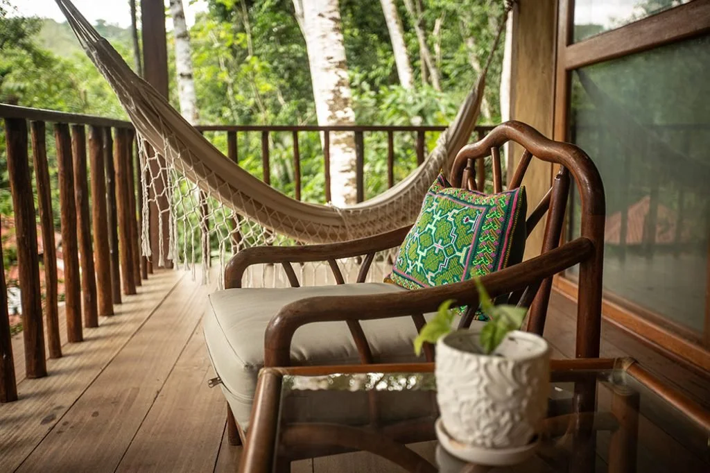 The open air ceremonial space sits on a raised platform with elevated views of surrounding trees and plants. This space also serves as a peaceful meditation zone and yoga shala during the day. Enjoy the constant symphony of the Amazon jungle, gently sway in hammocks, or swim in the river on a hot afternoon.